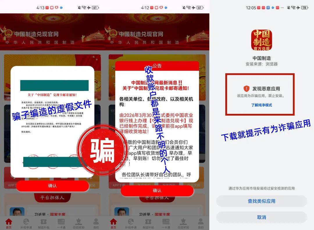此前“中国智造”早已被官方点名曝光为诈骗项目,骗子随后更名“中国制造”,又推出多款涉诈App“中国制造2025”“中国制造2026”等等,近期有出现了一个“中国制造兑现”项目,谎称发放560万补偿款,还要求办理所谓的专属“兑现卡”。