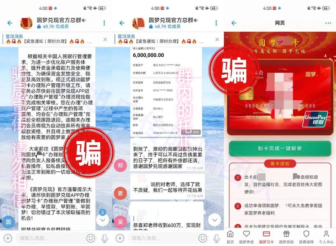 这个骗局已经持续一段时间,近期还更新了诈骗套路:一方面以“提现、圆梦、领取福利”为噱头,诱导大家办理所谓“圆梦卡”,收取工本费、邮寄费;另一方面对认清骗局、想要退出的人,假意承诺“可办理退费”,借机索要身份认证费。