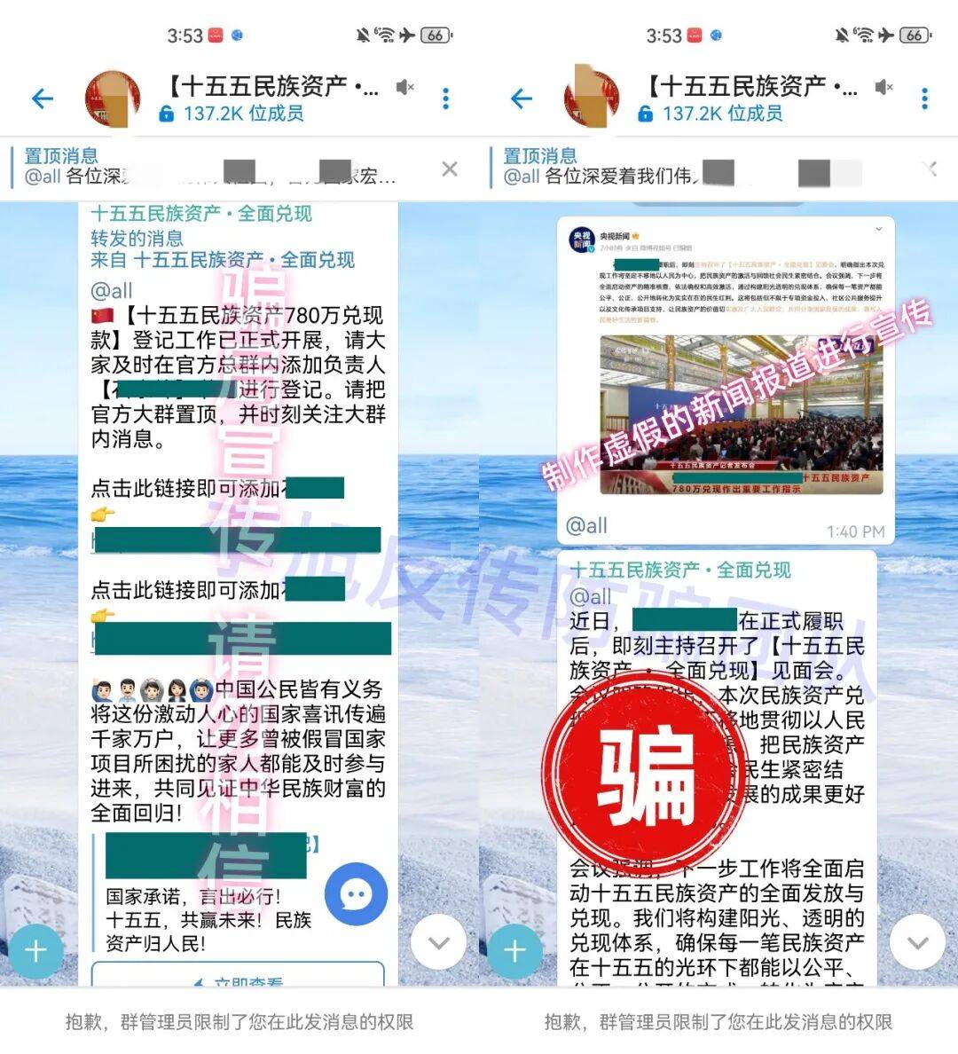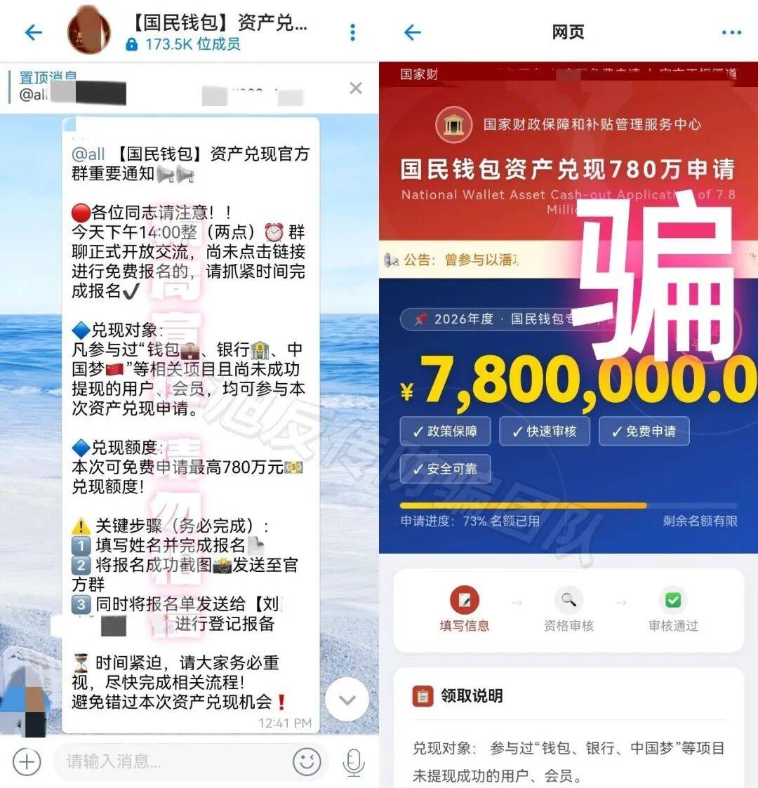 骗子谎称国家拨款8600亿民族资产专项资金,要给每个参与者发放780万兑现款,还在诈骗群里利用AI制作虚假宣传视频,误导不明真相的人登记身份信息。