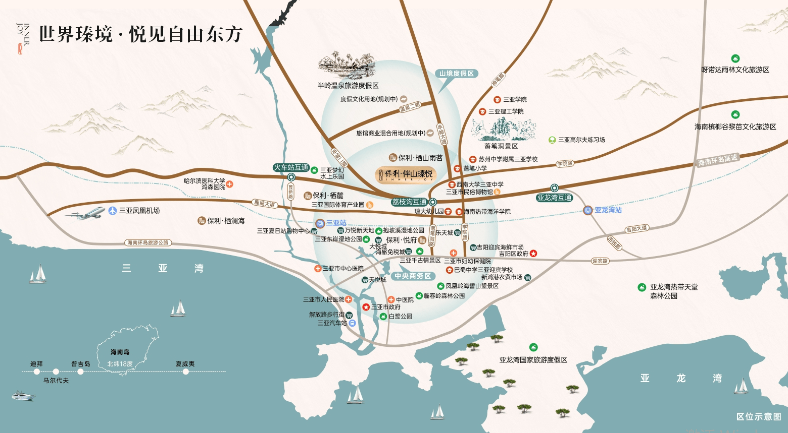 保利·伴山瑧悦紧邻主城荔枝沟、迎宾路、火车站等繁华商圈,项目北向为城市主干道落笔洞路,可轻松通达三亚全城;紧邻高速路口、高铁站,可速达机场。出则尽享城市便利交通及繁华配套、入则奢享人文山境风光,闹中取静,离尘不离城的度假胜境。
