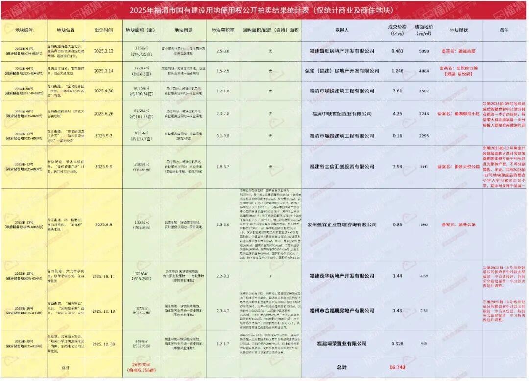 其中,大部分地块都是底价成交。但也不乏激烈争夺的热门地块。溢价率最高的地块莫过于音西街道石门村的宗地2025拍-12号地块,该地块的拍卖吸引了包括融湾投资、聚福鑫实业、福建省金信汇创投资有限公司、雄旺集团在内的6家竞买人报名争夺。最终,该地块花落福建省金信汇创投资有限公司,成交价为2.94亿元,成交楼面价为3441元/㎡,成交亩价为848.73万元。溢价率约为30.38%。该地块也是整个2025年福清土拍争夺最激烈的地块。