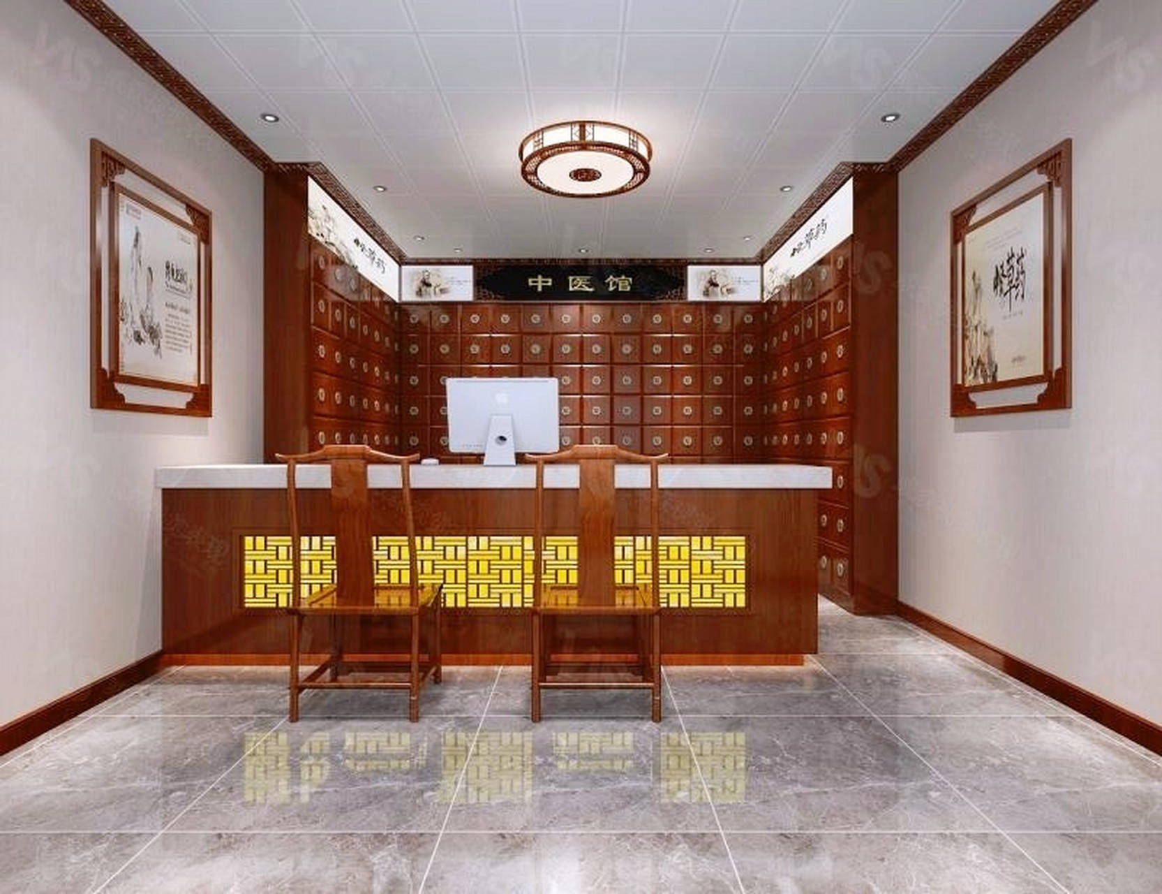 氛围营造:最终通过上述设计理念、色彩搭配、材质选择、细节处理及光影效果的综合运用,中医馆内部营造出了一个宁静致远的氛围。这种氛围不仅让患者在就诊过程中感受到身心的放松与舒缓,还进一步提升了中医馆的整体形象和专业性。