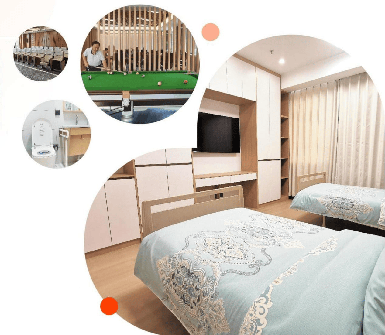 ❒ 设施亮点:地上共三层,房型丰富,涵盖高端房、标准间、套间及多人间,可满足不同消费能力与居住需求。配套设施完善,设多功能活动大厅、康复大厅、阅读空间、合家欢餐厅等,户外配备优雅茶座、活动广场、安全步道,同时全方位多角度监控覆盖,保障长者居住安全。