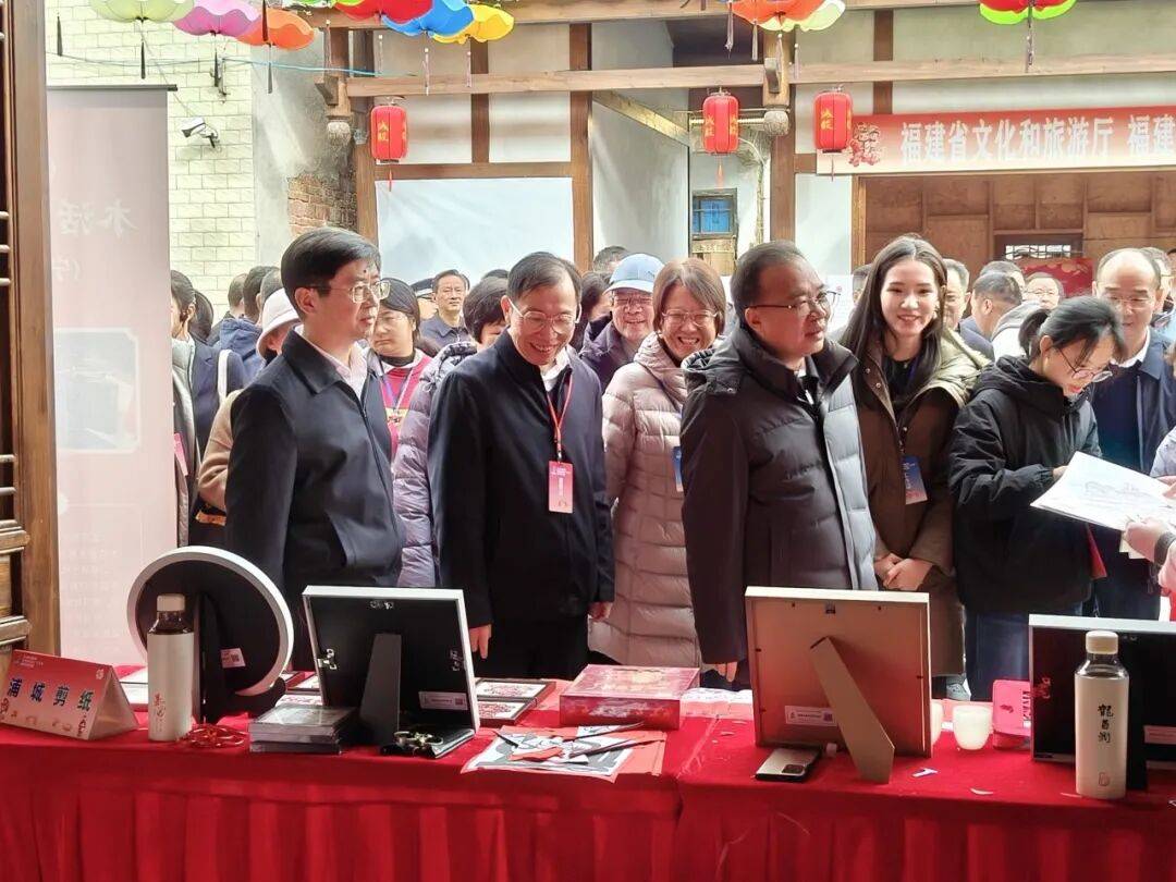 ●省委常委、宣传部部长张彦(前排左三)等领导嘉宾,在省文旅厅党组成员、副厅长肖长培(前排左二)陪同下,了解浦城剪纸